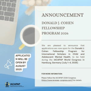 Die Internationale Gesellschaft für Kinder- und Jugendpsychiatrie (IACAPAP) schreibt jährlich das Donald J. Cohen Fellowship Program für internationale Forscher*innen im Bereich Kinder- und Jugend Mentale Gesundheit aus. Alle Informationen zum Program finden Sie nachfolgend: Dear colleagues, We are pleased to announce that applications are now open for