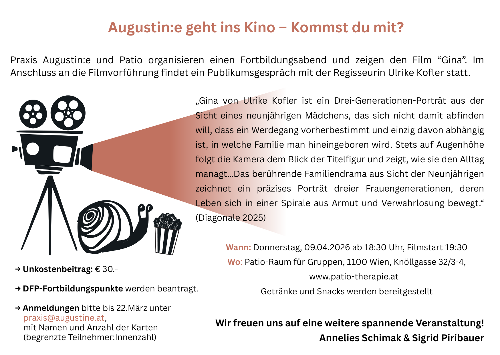 Titel: „Gina", Filmvorführung und Diskussion zu Obsorgeentscheidungen zwischen Armut und Vernachlässigung.  Zeit: 9.4.2026 19:30-22:00 Inhalt: „Gina" von Ulrike Kofler ist ein Drei-Generationen-Porträt aus der Sicht eines neunjährigen Mädchens, das sich nicht damit abfinden will, dass ein Werdegang vorherbestimmt und einzig davon abhängig ist, in welche Familie man […]